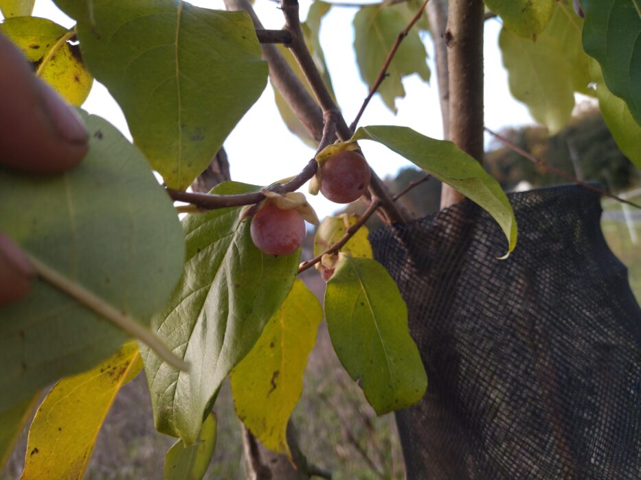 Une autre espèce du genre diospyros, proche de diospyros lotus, très vigoureuse et à grandes feuilles vert sombre brillant, qui produit de tous petits kakis ronds (1,5cm) très sucrés, qui sèchent très facilement et font de très bonnes petites «dattes» au goût de kaki. Récolte fin novembre.